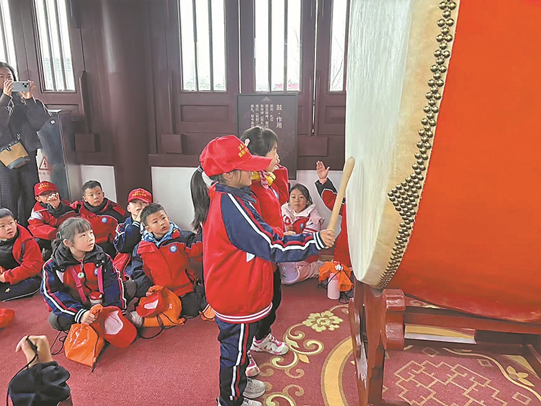 昭明台共分为五层,每一层都藏着不一样的精彩。第一层有各种文创产品。第二层是“昭明之盛”展厅,生动讲述着昭明太子的传奇故事和与之相关的文化典故。第三层的“城纪千年”展厅最让我着迷,它就像一本会动的历史书,将襄阳古城的岁月变迁娓娓道来。到了第四层,我们一下子就被窗边的大鼓吸引住了。和大鼓遥遥相对的,是一口青色的大钟,撞击时声音浑厚响亮,余韵悠长。第五层是昭明剧场和兰凤戏曲艺术博物馆。