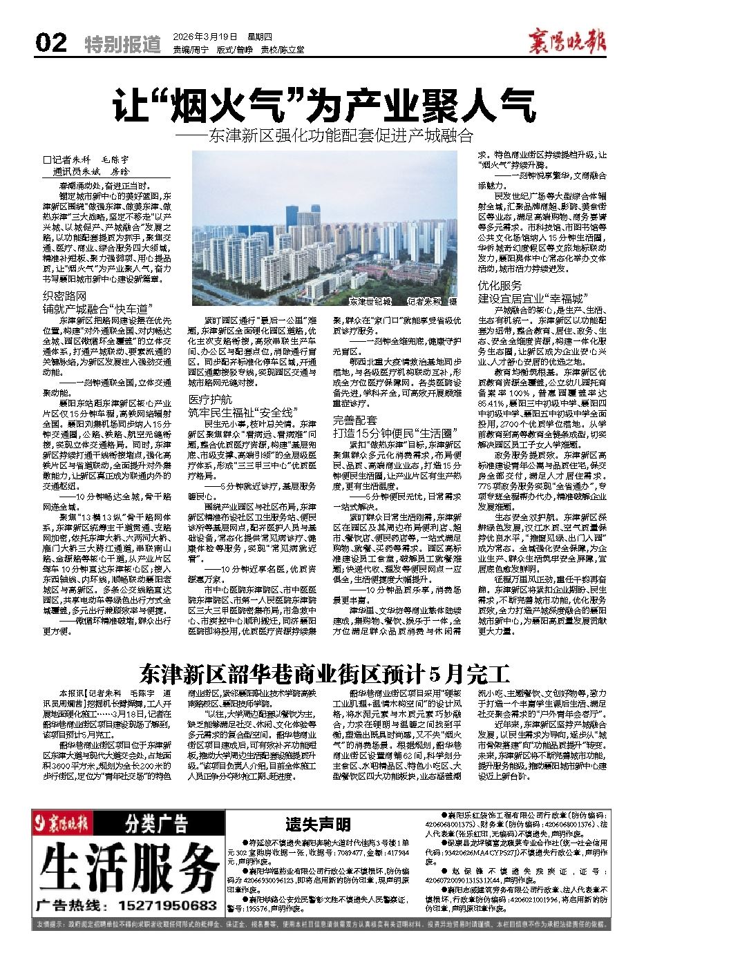锚定城市新中心的美好蓝图,东津新区围绕“做强东津、做美东津、做热东津”三大战略,坚定不移走“以产兴城、以城促产、产城融合”发展之路,以功能配套提质为抓手,聚焦交通、医疗、商业、综合服务四大领域,精准补短板、聚力强弱项、用心提品质,让“烟火气”为产业聚人气,奋力书写襄阳城市新中心建设新篇章。