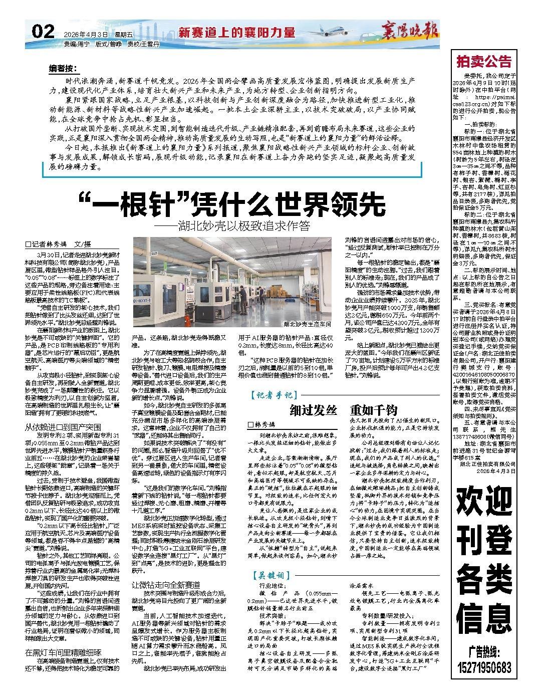 从攻克极小径钻针,到实现核心设备自主研发,再到驶入全新赛道,湖北妙壳完成了一场颠覆性的跃迁。它以极致精度为利刃,以自主创新为坚盾,在高端制造的世界里扎根生长,让“襄阳造”拥有了更硬的科技底气。