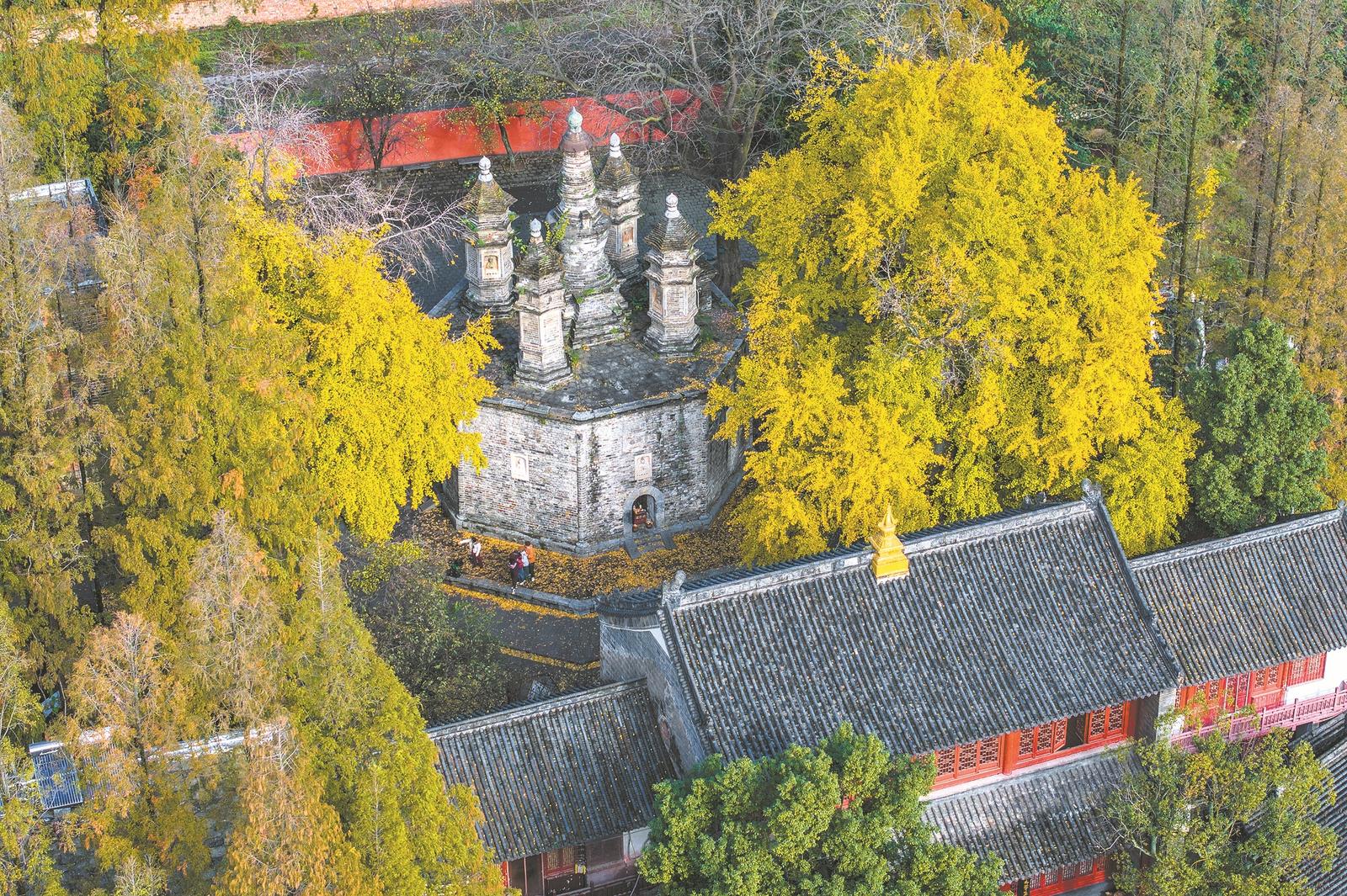 11月18日,广德寺内的多宝塔与古银杏树相映成景,吸引人们前来观赏。最近,襄阳市广德寺内一株树龄1500多年的古银杏树进入最佳观赏期。据了解,国家文物局、国家林草局、住房和城乡建设部此前联合公布了第一批“国保单位·古树名木”协同保护名录,共涉及全国28处古树名木,襄阳市广德寺多宝塔·将军树入选。 全媒体首席记者杨东 摄