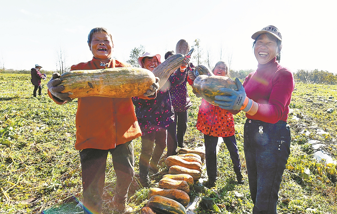 11月19日,南漳县肖堰镇耀妙家庭农场农民笑逐颜开地采摘南瓜。今年,该农场种植的低纤维、高蛋白的300亩金园蜜本南瓜在遭受干旱、连阴雨的情况下,仍然喜获丰收,亩产可达2000公斤。