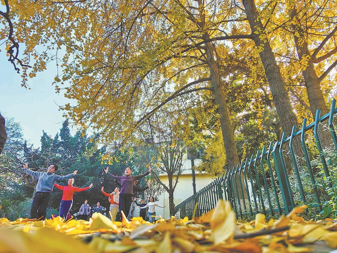 11月25日,市民在新华公园银杏树下游玩。襄阳市住新局新华游乐公园管理处对园内银杏树下区域实施“落叶缓扫”,让市民在此拍照、打卡、游玩,近距离欣赏初冬美景。