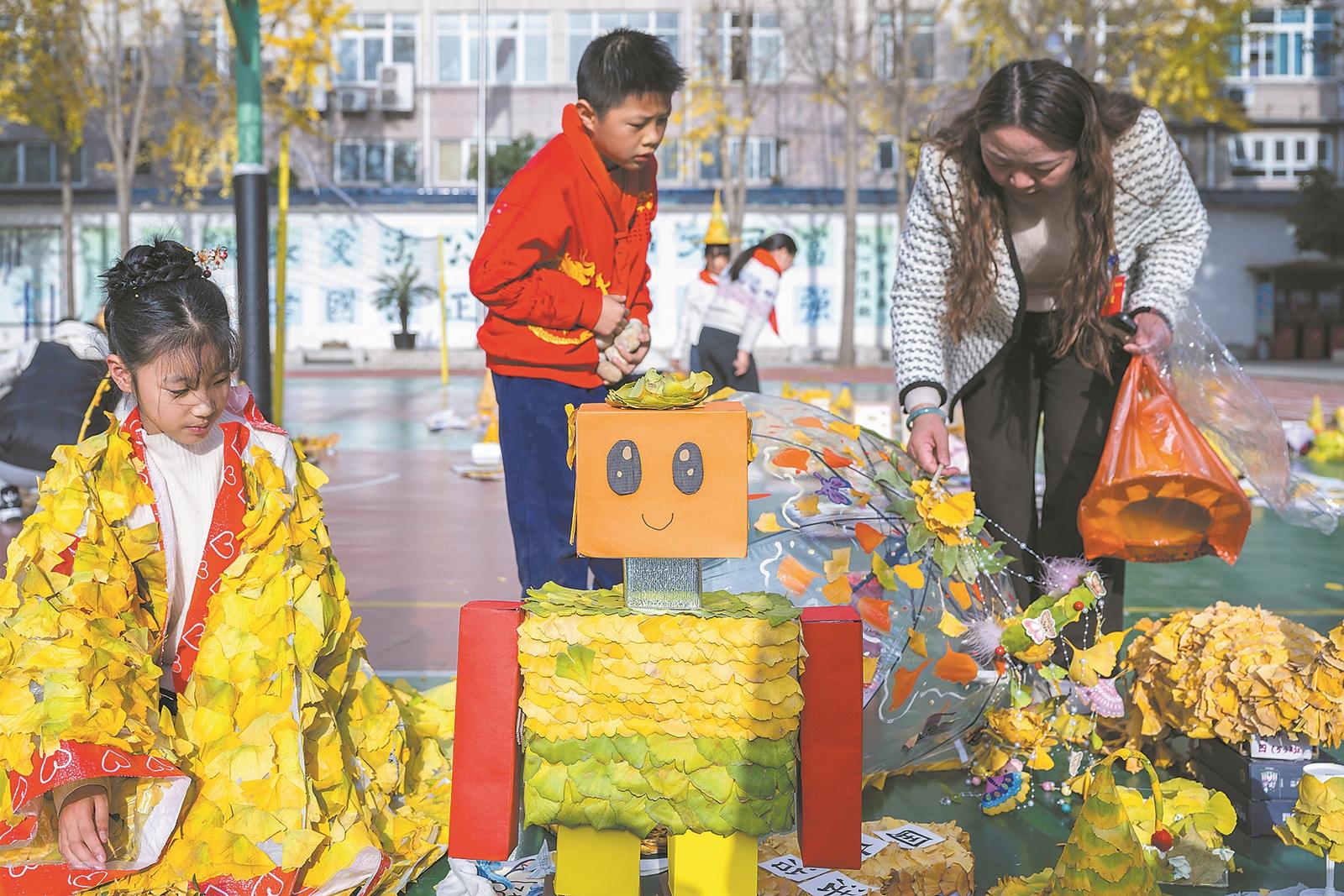 11月26日,米公小学举办银杏文化节。活动现场,学生赏叶、诵诗、唱童谣,并将银杏叶融入文化衫、饰品创作,让学生在实践中感受自然之美,提升审美素养,增强动手能力。据悉,每逢银杏叶泛黄时节,该校便会开展此项特色活动,今年已是第12届。 全媒体记者李旭晖 摄