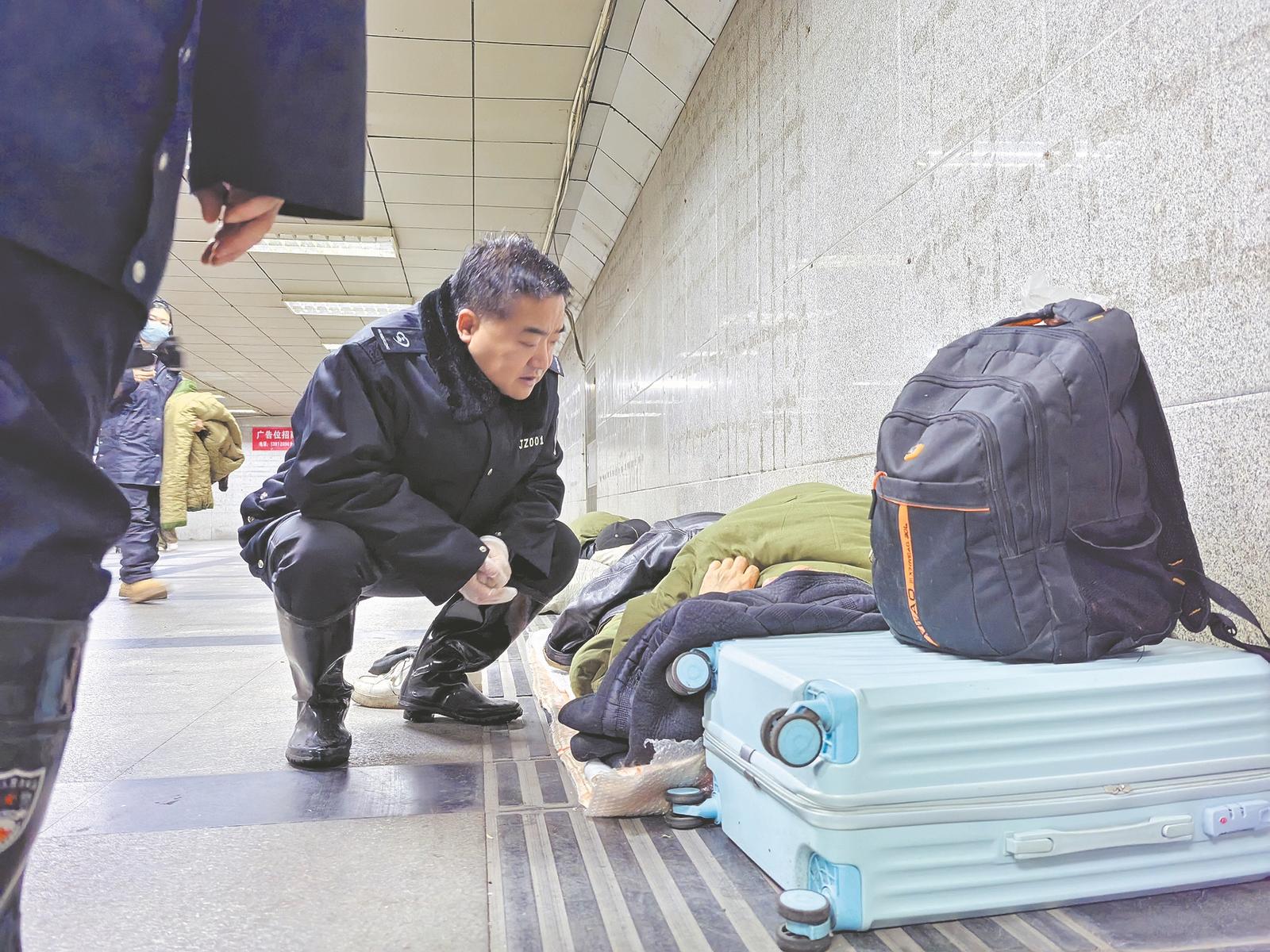 针对不同的受助人群,救助站采取分类救助方式。对未成年人、残疾人等特殊人员,救助站协同公安、城管等部门劝导护送至救助管理机构;对疑似精神障碍患者,及时通报公安机关核查身份信息;对危重病人,严格遵循“先救治、后查询原则”,第一时间送医诊治。当晚,在襄阳火车站地下通道,一名老者躺在入口处(如图)。市救助管理站站长管志伟询问得知,这名老人姓王,与家里人发生矛盾后离家出走。“到我们救助站去,就到我们那里过个年,吃住都有,还能洗澡!”经劝导,老人来到市救助管理站,度过了一个温暖的夜晚,后续该站还联络了社工,与其家属联系,将其送回家。