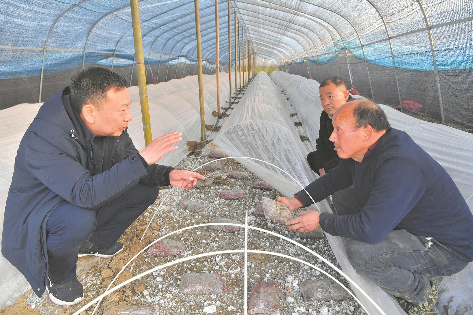 1月16日,襄城区卧龙镇农技站站长高雄文来到薛梁村羊肚菌种植基地,指导种植户做好加固大棚、覆膜保温等防冻防雪措施,积极应对恶劣天气。