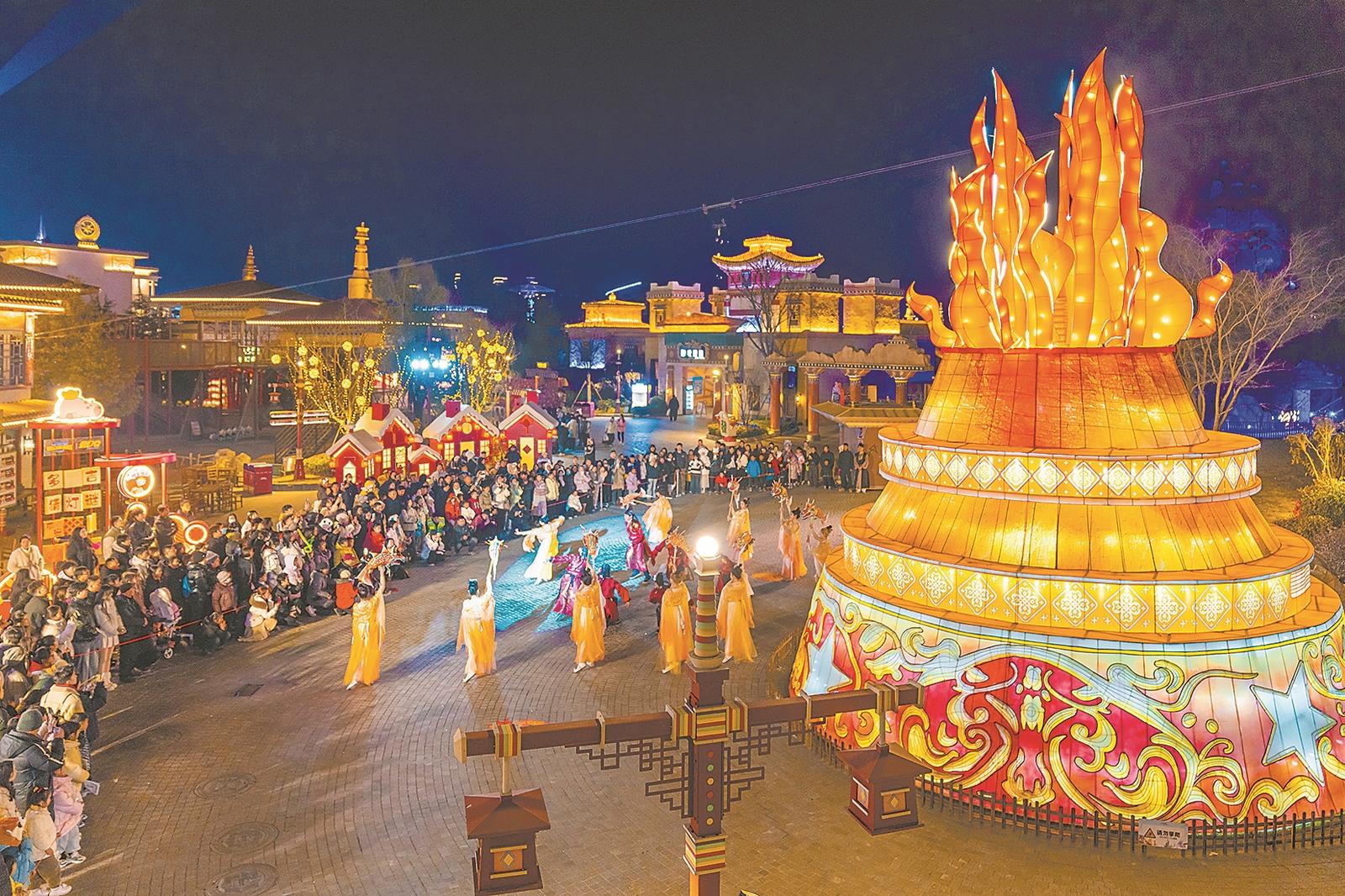 襄阳华侨城奇幻度假区奇幻谷用一场盛大的灯会增添了喜庆、祥和的气氛。由自贡非遗匠人制作的30余组大型彩灯点亮,构成一幅绚丽的光影画卷。4条“巨龙”盘柱昂首,中央“彩凤”展翅欲飞,祥云缭绕间,“龙身”与“凤羽”交替闪烁五彩光芒,形成“龙飞凤舞”的视觉效果。“凤凰于飞”尤为震撼,8米高的“凤凰”展翅欲飞,尾羽如瀑布般倾泻而下,伴随着悠扬的凤鸣音效,灯光由暗渐明,仿佛神鸟涅槃重生。在“楚天巨焰”前,充满异域风情的“雪域神女”表演将现场气氛推向高潮。