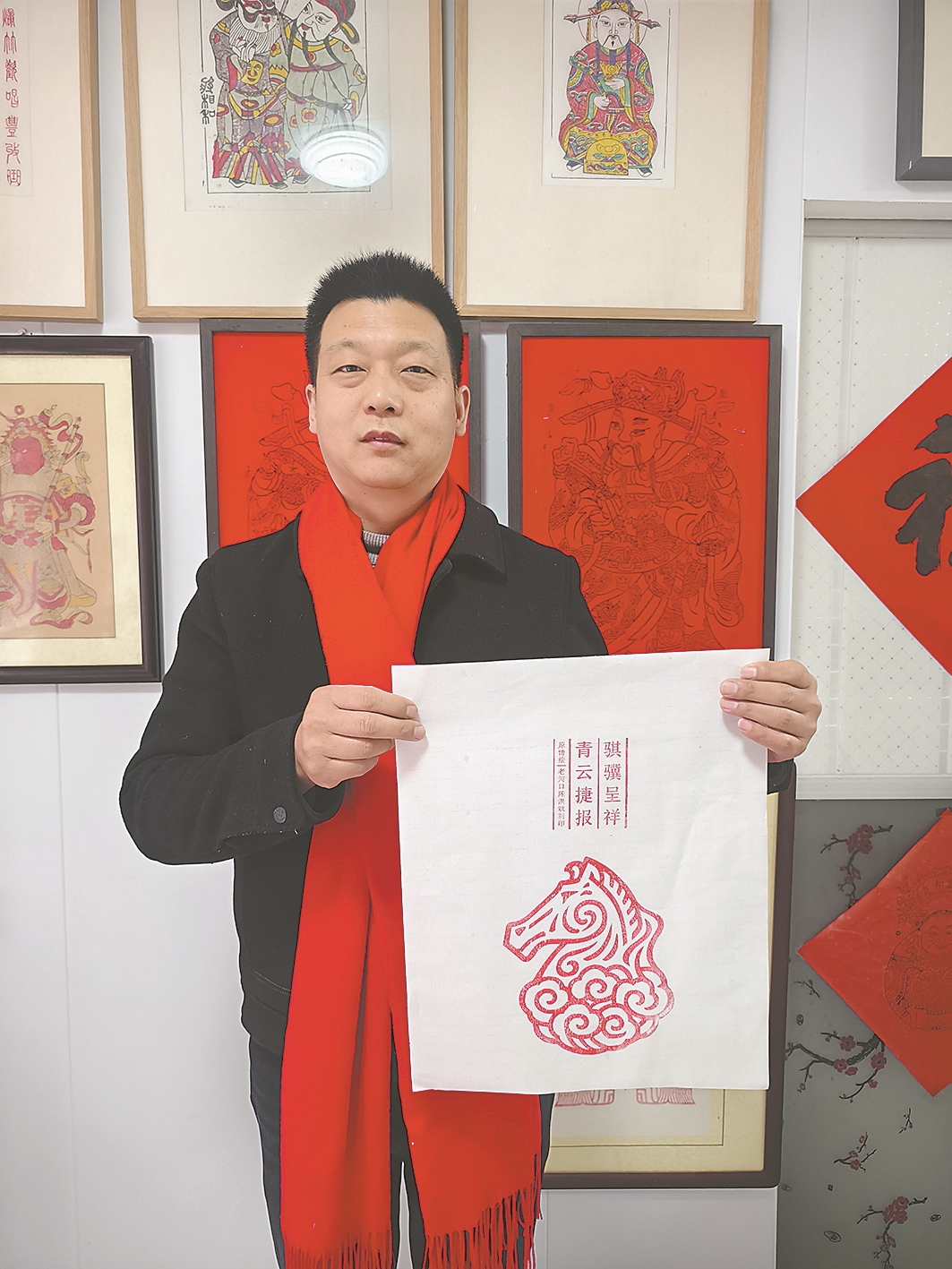 本报讯【全媒体记者张亚婷】当传统木版年画遇见现代设计理念,将碰撞出怎样的艺术火花?近日,国家级非遗老河口木版年画传承人陈洪斌与清华大学美术学院副教授原博合作推出的新作《云骥呈祥》正式亮相。作品由原博设计,陈洪斌雕版印刷,融合了传统技艺与现代审美,以骏马凌云之姿传递着“青云直上、捷报频传”的美好寓意。