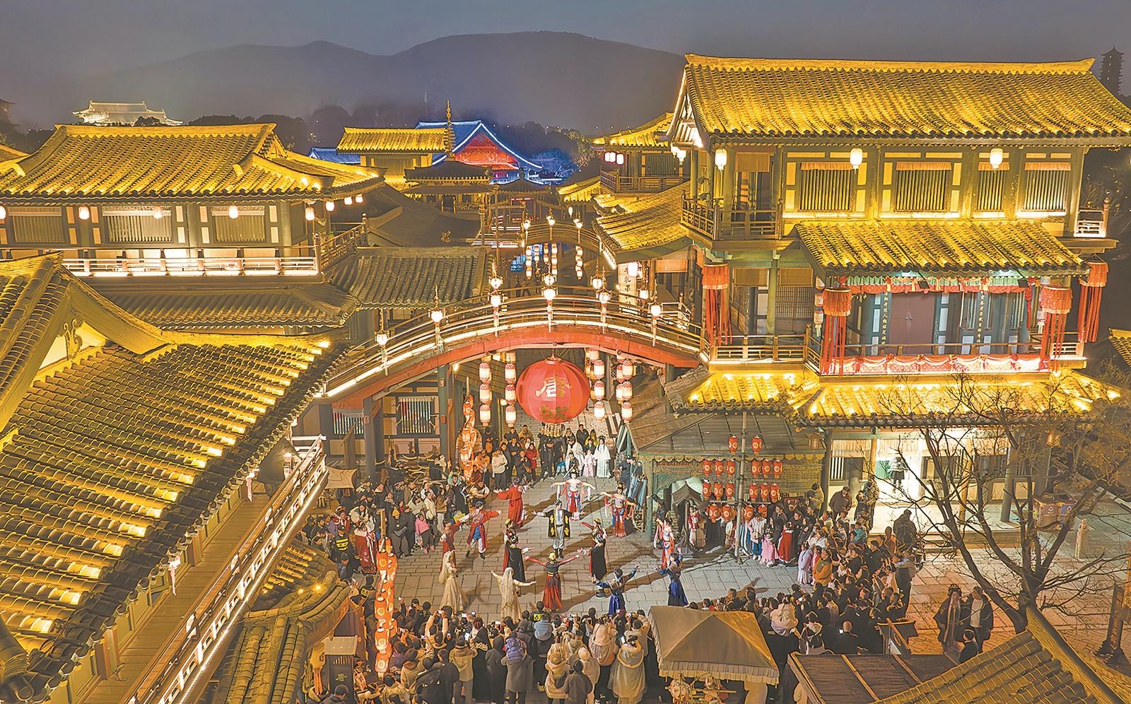 2月10日,游客在襄阳盛世唐城景区观看舞蹈表演。当天,该景区启动新春嘉年华活动,丰富多彩的节目表演、流光溢彩的灯光秀,让游客在喜庆的氛围中感受浓浓年味。