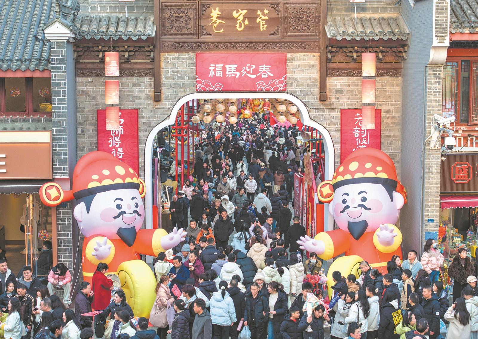 2月18日,游客在襄阳古城游玩。春节假期,襄阳古城张灯结彩,年味浓郁。游客游览古街巷,品尝特色美食,欣赏美丽夜景,乐享美好假期。