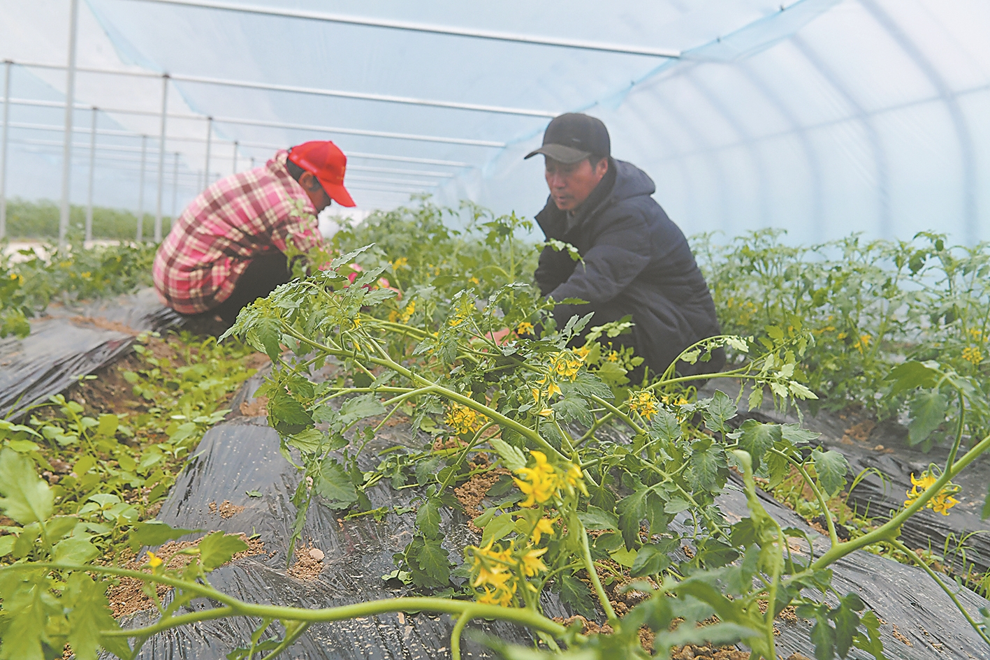 3月5日,襄城区尹集乡千弓蔬菜基地圣女果种植大棚内,技术人员在对西红柿苗进行抹芽处理。