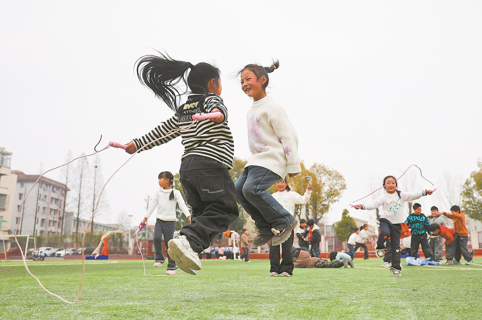 3月9日,樊城区竹条中心小学,学生们在操场上开展跳绳、踢足球等体育活动,乐享大课间欢乐时光。