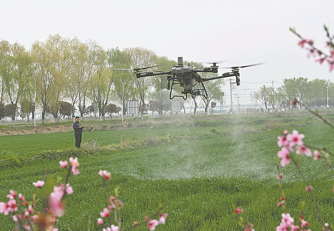3月26日,在襄州区张家集镇何岗村,飞手操作农用无人机为晚播小麦喷施叶面肥。时下正值春季田间管理关键期,襄阳各地抢抓农时,积极开展春管作业,田间地头一派繁忙景象。
