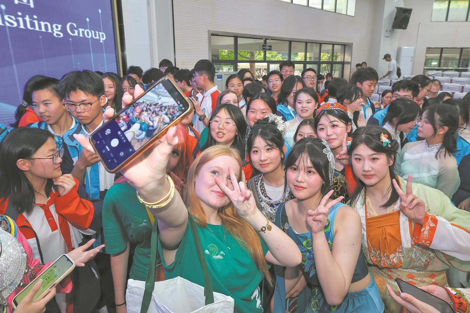 4月10日,新西兰坎特伯雷大学孔子学院中学生与襄阳五中学生合影留念。